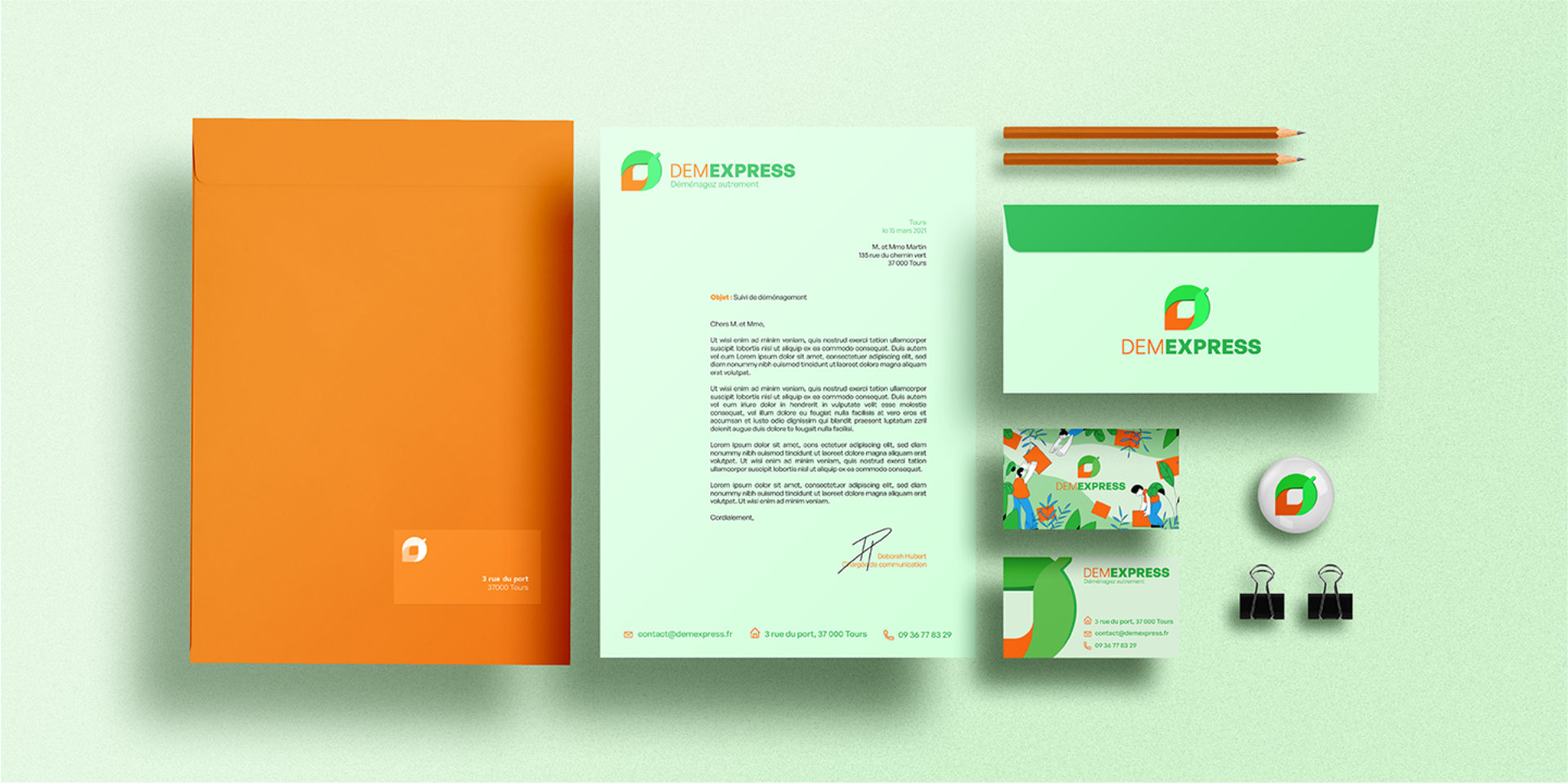 Entreprise fictive, j’ai inventé Dem’Express spécialement pour me permettre d’explorer un branding coloré et illustré. Portée par des valeurs écologiques et solidaires, cette petite entreprise propose de nouvelles manières de déménager.