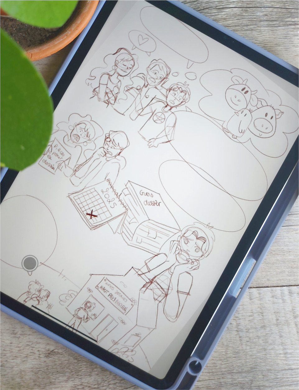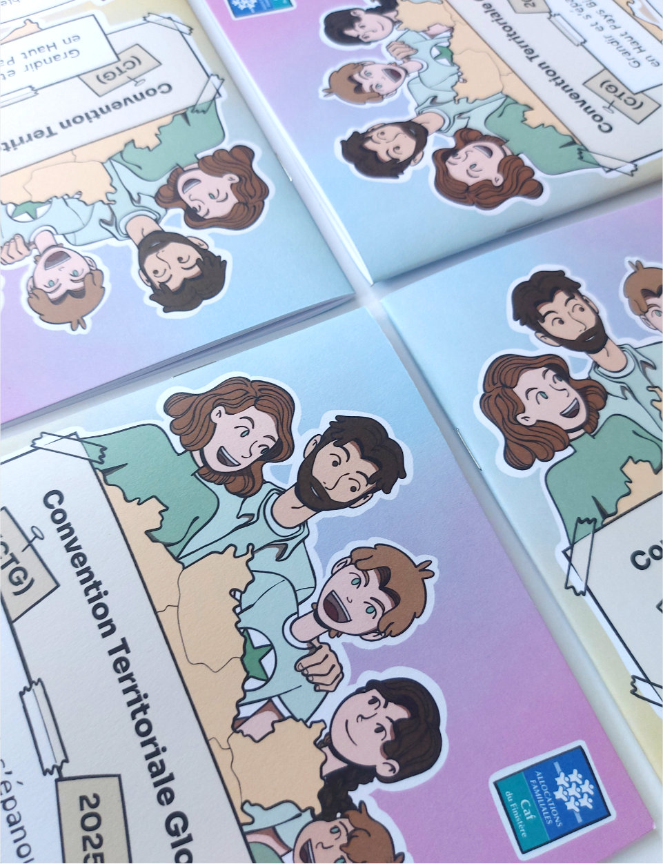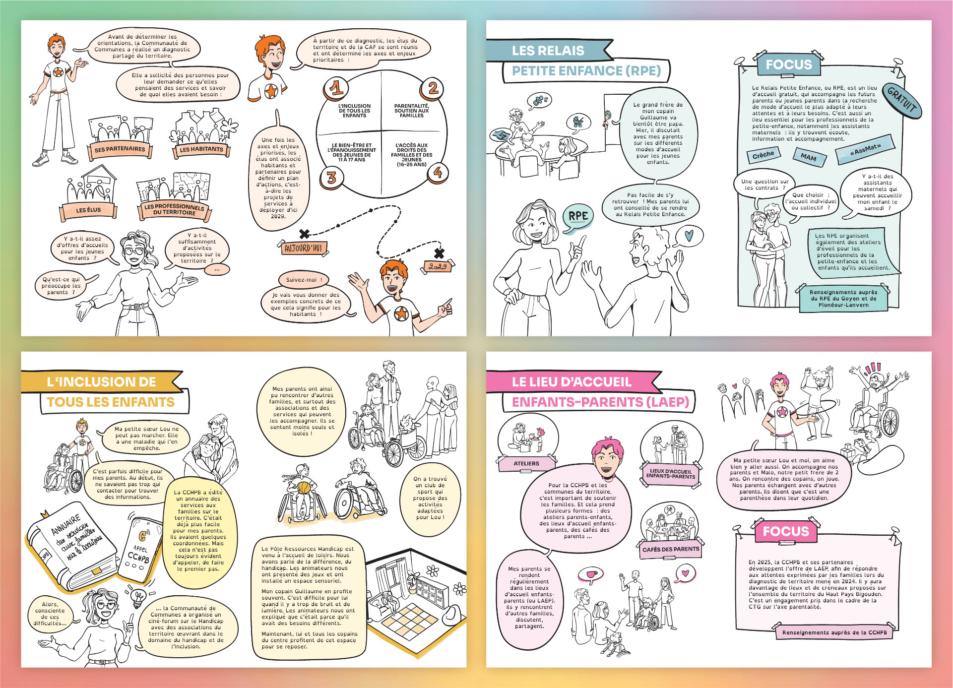 Afin de toucher leurs habitants et leur faciliter l’accès à ces services, la CCHPB a souhaité vulgariser la CTG. Nous avons choisi de le faire sous forme d’une bande dessinée de 24 planches que j’ai eu le plaisir d’illustrer et mettre en page. Celle-ci illustre la vie de Camille et de ses proches.