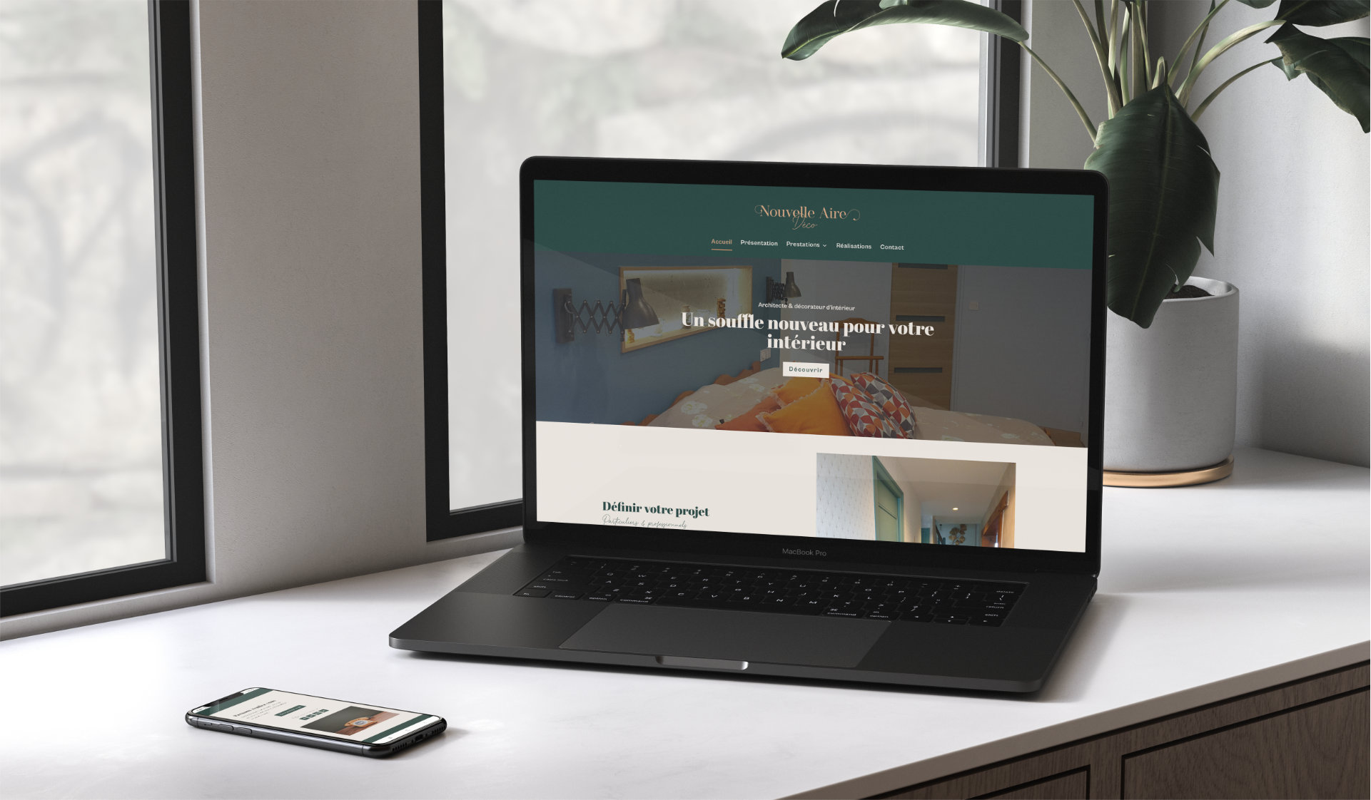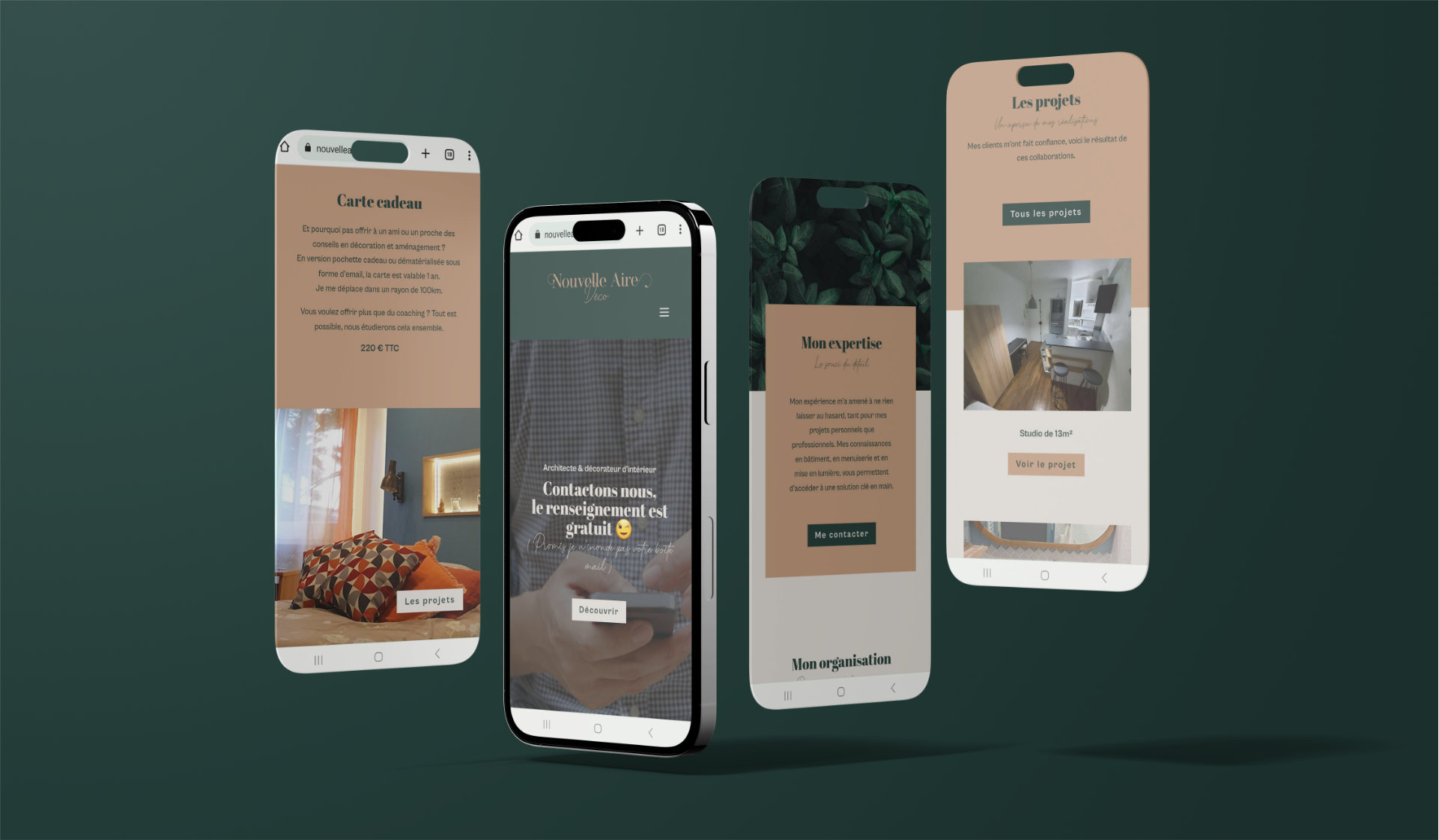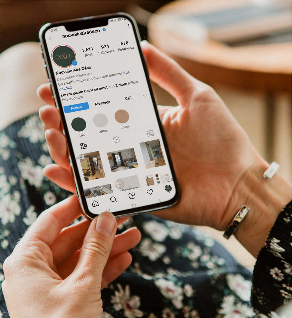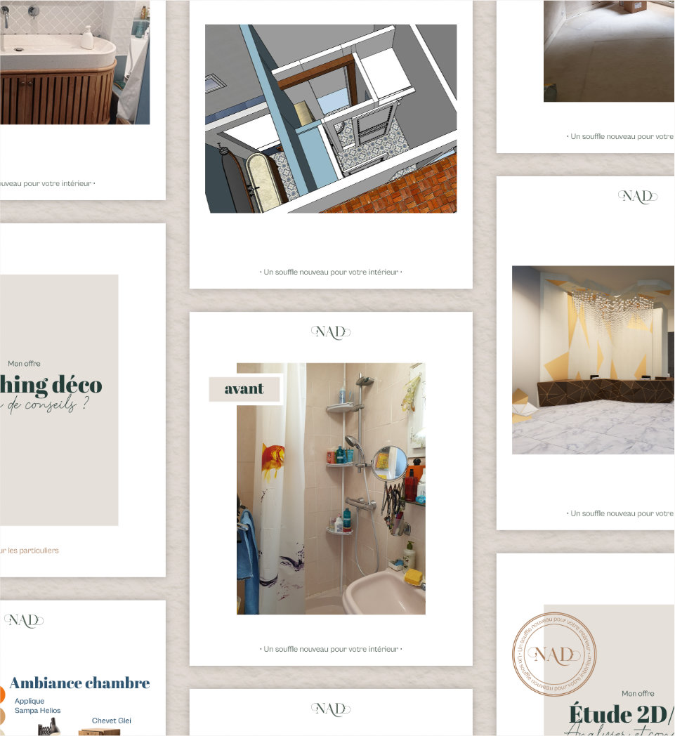 Nouvelle Aire Déco est une entreprise de décoration d’intérieur. Erwan, son fondateur, a fait appel à moi pour lui créer tout ce dont il avait besoin pour se lancer : identité visuelle, site vitrine, cartes de visites, dépliant et templates Instagram. Pour qu’il puisse présenter ses propres projets à ses clients, je lui ai aussi mis au point un template facilement modifiable de dossier de présentation.
